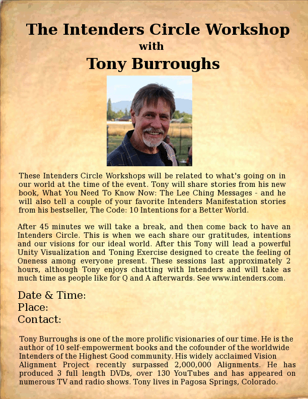 After 18 years in a secret mystery school in the rainforests of Hawaii, author Tony Burroughs joined with three friends and they started their first Intenders Circle. One of their first "intentions" was to bring personal power into the lives of their fellow travelers and, at the same time, create a workable model for gathering people together in an awakened community. Within days of making that “intention” Tony met Lee Ching, a gentle wise man, who offered to guide him and his Intenders friends to become more proficient at manifesting their dreams. What happened next, as they say, is history. Their amazing collaboration gave birth to thousands of Intenders Circles all across the globe.